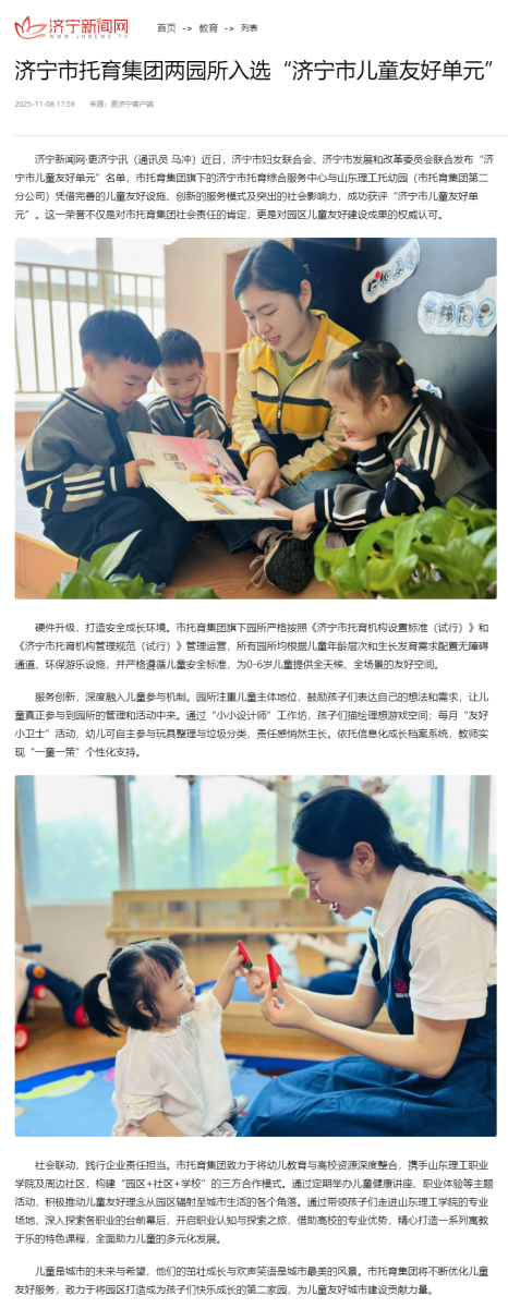 《济宁新闻网》| 济宁市托育集团两园所入选“济宁市儿童友好单元”