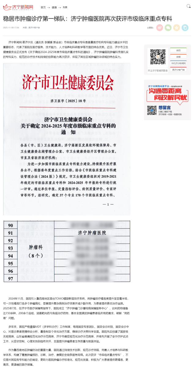 《济宁新闻网》| 稳居市肿瘤诊疗第一梯队:济宁肿瘤医院再次获评市级临床重点专科